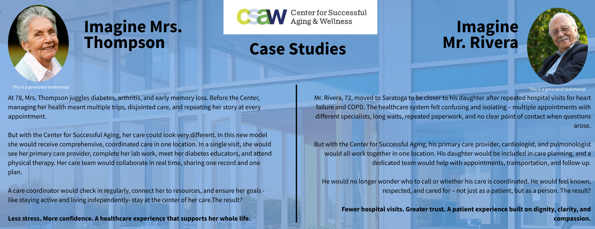 We are embarking on a transformative development project to construct The Center for Successful Aging & Wellness, a 60,000 square foot facility located at 59 Myrtle Street, Saratoga Springs, NY. This comprehensive and coordinated care is redefining aging and wellness and tailored to the needs of people as they age within a specialized healthcare model.